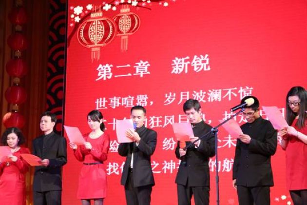在迎新party上,由陶城报社管委会主任、总编辑李新良领衔朗诵的《陶城报之歌》,是参与者人数最多的节目,由来自五湖四海的陶城报精英们组成。除了普通话,还运用了四川话、湖南话、粤语等具有特色的地方语言,深情地表达了内心的感受。陶城报24岁,真实写照,感人肺腑!24年了,确实是一份感动,也是一个奇迹。 在一个羊都想变成狼的时代,要赢得别人尊重,你必须做狮子。当晚这群创造奇迹的狮子展现出来的不光是自己的风采,更是陶瓷界精英的飒爽英姿和专业精神。其中用方言朗诵是一大亮点,当大家熟悉的湖南话、广东、四川等地方言出现时,观众不禁感觉与自己更贴近了,甚至有人跟着轻声读起来。 这群精英来自祖国的四面八方,在新媒体园这块热土上集聚。就像是当年,所有的热血青年奔赴延安一样,他们忘我工作,为世界报道陶瓷。每周四的夜晚,是陶城报出刊前的奋战之夜,每一期报纸,都凝聚着每一个编辑记者的心血。 就是这样一群人,凝聚成了新锐的力量。 ![]()