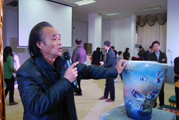本次艺术作品展从12月21日-26日,持续6天。来自瓷都景德镇的胡景文教授带来了60多余原创的精美陶瓷艺术作品进行展销,其中以海洋系列、自然系列、冰川系列、原始森林系列的作品最具代表性。据胡景文教授介绍,他的作品融合了保护环境、爱护自然的思想,“以海洋为主题主要是想倡导人们关注未来、关注海洋资源、关注人类未来的发展空间。以冰川为主题想提示人们关注地球变暖、冰川融化,从而更加保护环境,保护我们生存的地球”。