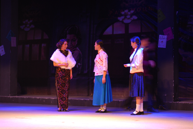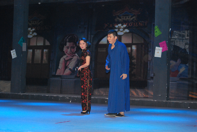 老上海味道 音乐响起,前幕缓缓拉开,观众看到是一幅洋溢着浓郁民国气息的舞台背景,百乐门、天马影业、中国国货公司,还有满街的默片电影的宣传海报。剧中采用大量的经典老歌曲作为背景音乐,在迷离的灯光下,仿佛回到了上个世纪二、三十年代的老上海。值得一提的是,这次舞美设计充分利用了云空间音乐厅的原有三根柱子,将其打造成旧上海的骑楼,这样的舞台空间感更强,阮玲玉与张四达在骑楼定情的一幕让人记忆尤深,舞台艺术之美也表现得淋漓尽致。