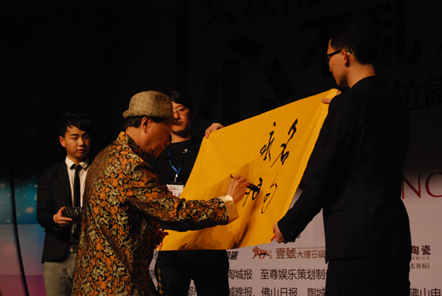 ![]() 卢家全老师现场挥毫。卢家全老师不仅带来了一首很有正能量、代表香港精神的《狮子山下》,铮铿有力的声音,振奋全场;卢家全老师还在现场分别用左右两手书写了两幅字,分别赠与映山红营销策划机构和杨彦伟。