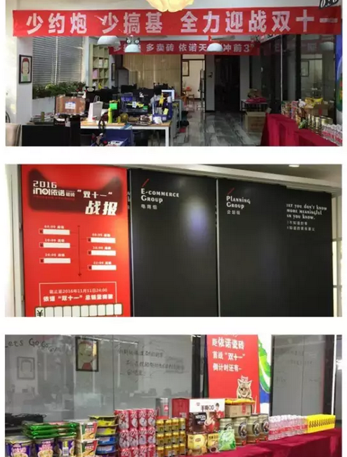 还未进入依诺办公室 就被紧张的气氛影响了 ”多接单、多卖砖,依诺天猫冲前三“ 瞧瞧这决心! 宣传口号、战报墙 连能量补给都准备好了, 拼吧!小伙伴们!