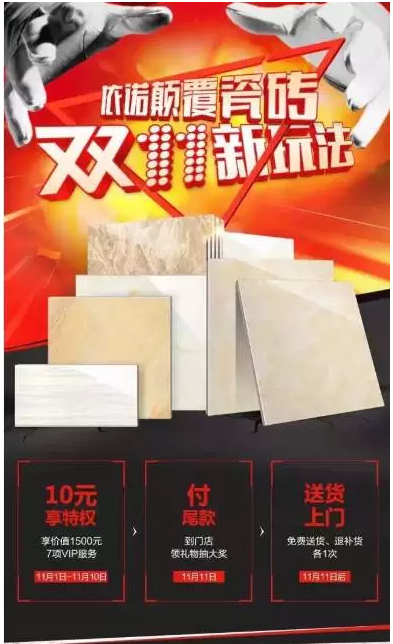 依诺天猫旗舰店上线产品均为线下实体店热销爆款,本次双11,依诺瓷砖线上线下紧密结合,消费者只要在依诺天猫旗舰店拍下10元特权金,就能到距离他最近的O2O体验店抵288元代金券+价格1500元7项上门服务大礼包。在激烈的角逐中,通过免费量尺、出图、送货上门、免费退补货安装等增值服务解决客户的后顾之忧,吸引了大量追求实惠和便利的消费者。