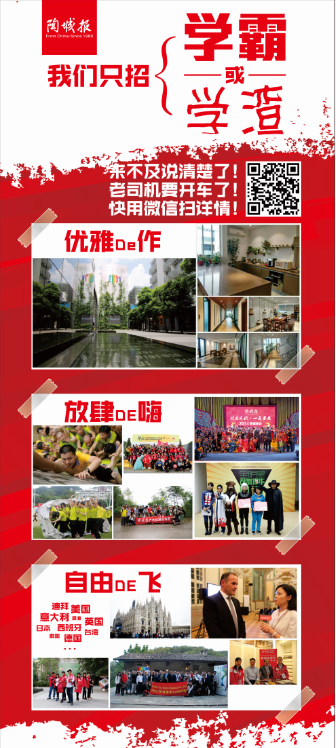 思维敏捷、勇敢创新,是年轻人才的优势,也是企业发展所需要的,他们身上所具有的无穷的智慧与潜能是企业最珍贵的新鲜血液,在新媒体集团,不需要你爸是李刚,无所谓介于牛A或牛C之间,也无须各种帝,不管你是学霸还是学渣,反正都可以逆袭了还怕什么。来吧,这让我们一起,得瑟的干,愉快的赚,放肆的嗨!