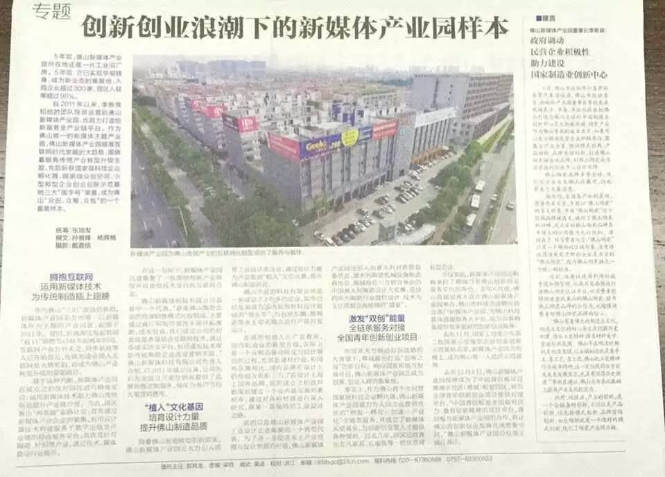 1月10日,《南方日报·佛山观察》以“创新创业浪潮下的新媒体产业园样本”为题做了专题报道: ![]() ↓↓↓
