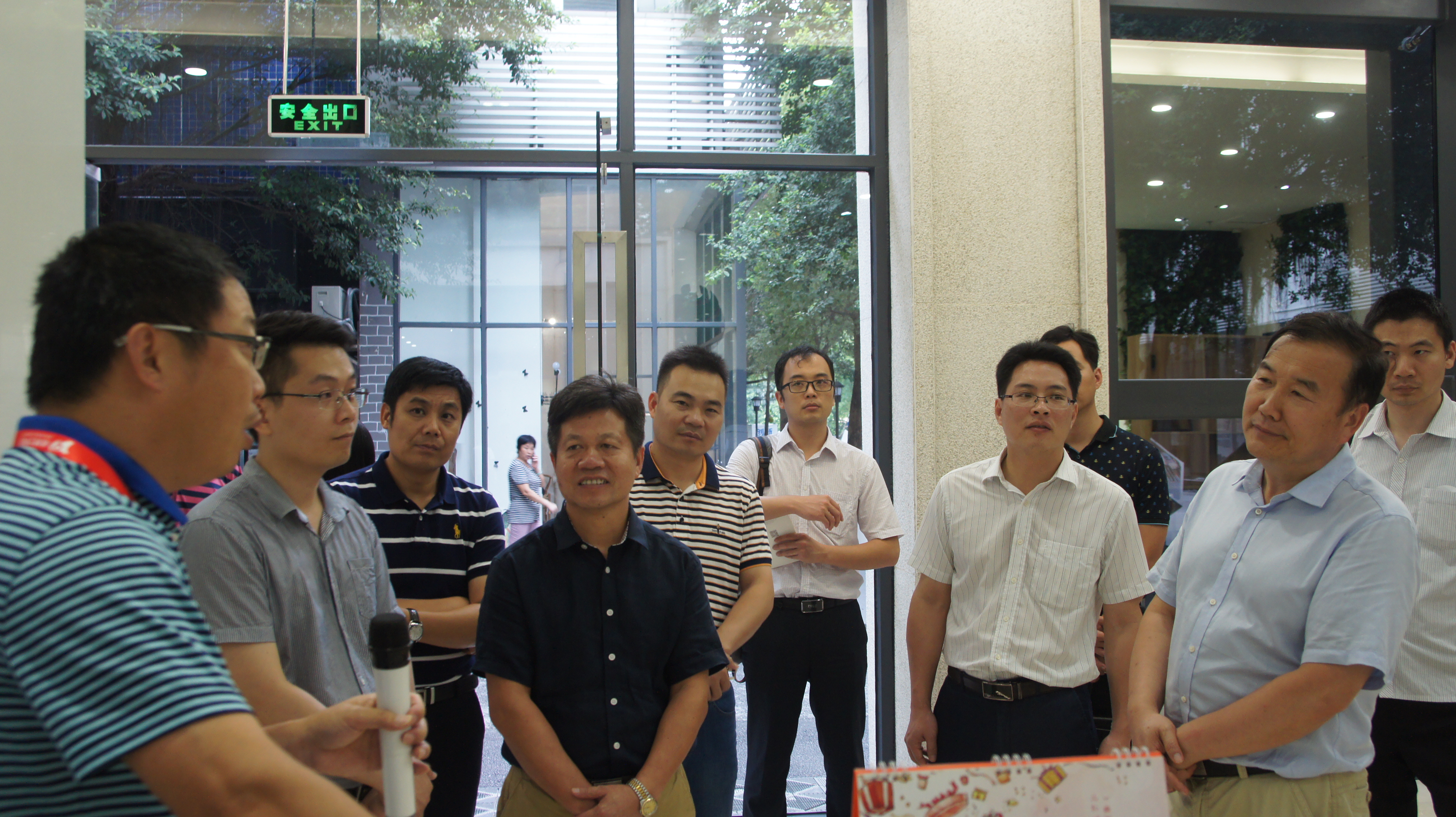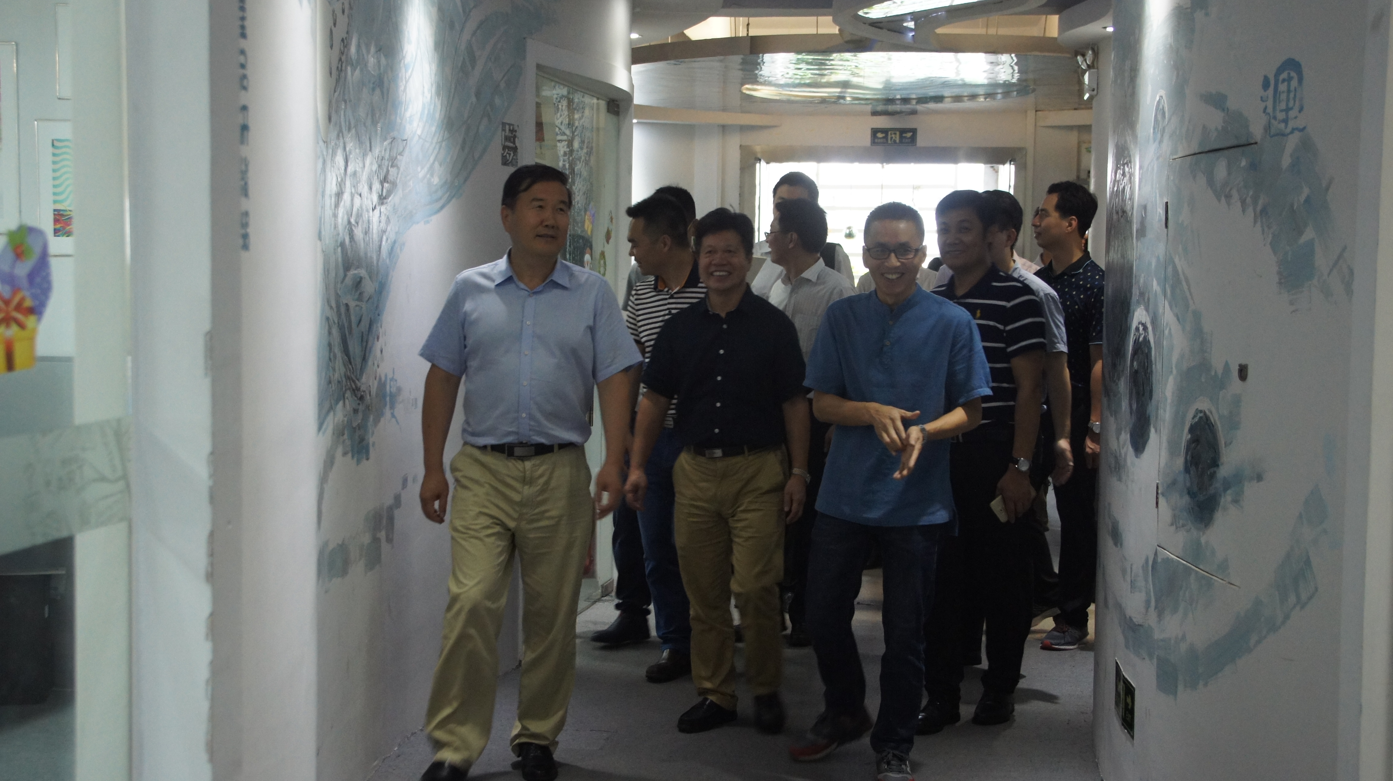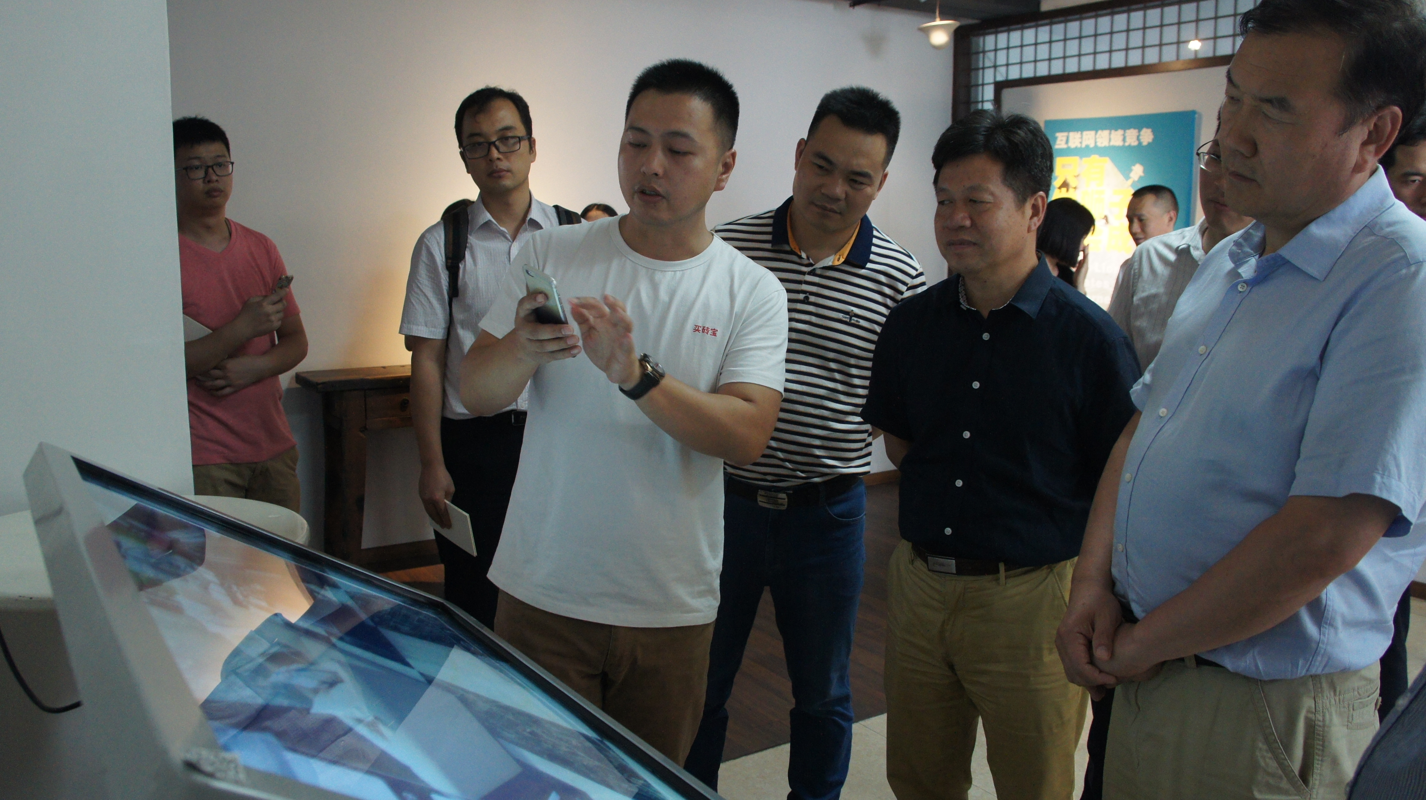 颜主任介绍新媒体产业园是在原有的厂区宿舍楼改造而成的互联网产业园区,目前入驻率达90%以上,近60%属于“互联网+”企业。周总在介绍新媒体园的情况时说到,新媒体园自2011年开始改造,从只长草、养老鼠、不见人的旧厂房发展至今,园区已拥有三大“国字号”荣誉——国家科技企业孵化器、国家级众创空间、小型微型企业创业创新示范基地。五年多的发展,培育了一批高速成长的创新型“互联网+”新媒体企业,形成了科技、媒体和互联网融合发展的创新创业生态圈。随后王处一行参观了园区高新技术企业佛山新媒体科技有限公司,该公司总经理张华向领导介绍了新媒体科技打造的“买砖宝”平台,这是一款为瓷砖商家、瓷砖消费者展示瓷砖应用效果的移动应用,利用新媒体技术降低陶瓷行业营销成本,解决门店销售的痛点,通过更好的体验帮助商家卖砖,帮助买家买砖。