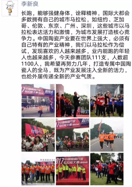 本次大赛由中国陶瓷工业协会、陶城报社主办,广东新媒体产业园、佛山博士创新梦工场承办,广东新媒体产业园工会联合会、广东新媒体产业园职工服务中心、佛山市科技企业孵化协会协办,不仅得到了佛山市科学技术局、佛山市禅城区总工会的指导,同时还获得了东鹏瓷砖·洁具、新中源陶瓷、金尊玉·大理石瓷砖、中陶联盟科技的大力支持。 自2015年首届中国陶瓷行业马拉松举办以来,马拉松大赛已经进入第三个年头。据主办方介绍,与前两届相比,本届马拉松呈现三大亮点。一是更为强调行业属性,重点鼓励陶瓷企业组队参赛;二是注重行程一以贯之:本届马拉松环绕绿岛湖长跑一周,路线以绿岛湖国际中心为起点,经过科海东路、河堤,灶沙村、禅港路、通过弘德北路再途经科海东路,最后回到终点绿岛湖国际中心,长度距离10.8公里。三是获得了陶瓷行业内外的广泛支持。除陶瓷品牌组队外,还有佛山市科技局、佛山市科技企业孵化协会、交警、媒体、律师、专家等精英团队参赛,得到了社会各界的积极响应和支持。 这场带着创新梦想与使命的马拉松带着激情开跑后,和马拉松同时开始的还有朋友圈摄影大赛,现在让我们一起通过精彩镜头来再跑一遍。 ![]() ▲上午8点,2017中国陶瓷行业马拉松鸣枪开跑。 前方高能!!! 别怪小新没提醒你! 看了你也会激动不已,