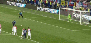 球赛第36分钟,克罗地亚队员手球犯规,法国获罚一点球,法国队员格列兹曼主罚。