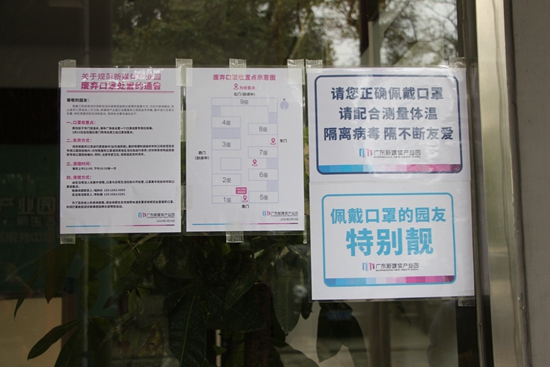 园区公共区域每天定时保洁,用指定消毒液消毒。每栋楼电梯消毒开始时间为8:00、10:30、14:00、16:00,公共洗手间、门把手消毒开始时间为10:30、14:00。 在东门、南门、瀑布广场均设有污染口罩回收垃圾桶。 二、加强人员进出管控 凡进入园区的人员必须佩戴口罩,对没戴口罩随意走动的人员进行及时劝阻提醒。所有人员进出园区需先测量体温,体温正常方可登记进入。临时封闭园区北门、西门,只开放东门、南门通行。 三、加强防疫宣传 利用微信公众号、客服微信、宣传广播等宣传防疫指引,张贴宣传海报、宣传标语,对园区防疫一线工作人员进行消毒知识培训。同时,积极引导园区企业做好员工信息排查及复工报备。 ![]() ![]() |
