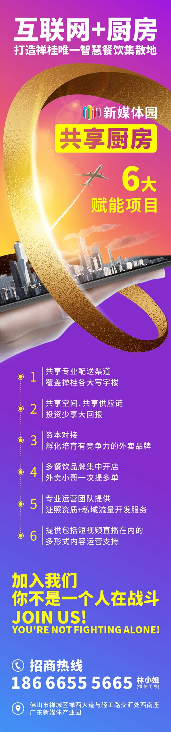 可同时容纳10+家特色餐饮企业 并提供共享用餐区域 我们将为入园餐饮企业提前做好位置规划 改造餐饮操作间 配备齐全的厨房必需设备 新媒体园共享厨房 六大赋能项目 ►共享专业配送渠道,覆盖禅桂各大写字楼 ►共享空间、共享供应链,投资少享大回报 ►资本对接,孵化培育有竞争力的外卖品牌 ►多餐饮品牌集中开店,外卖小哥一次提多单 ►专业运营团队提供证照资质+私域流量开发服务 ►提供包括短视频直播在内的多形式内容运营支持 园区内数百家企业的数千名员工 也将成为“共享厨房”堂食服务的长期稳定客源 为企业接入成熟的高性价比配送渠道和会员体系 可精准触达禅桂各大写字楼 突破传统外卖3公里区域 日均峰值1w+ ![]() |