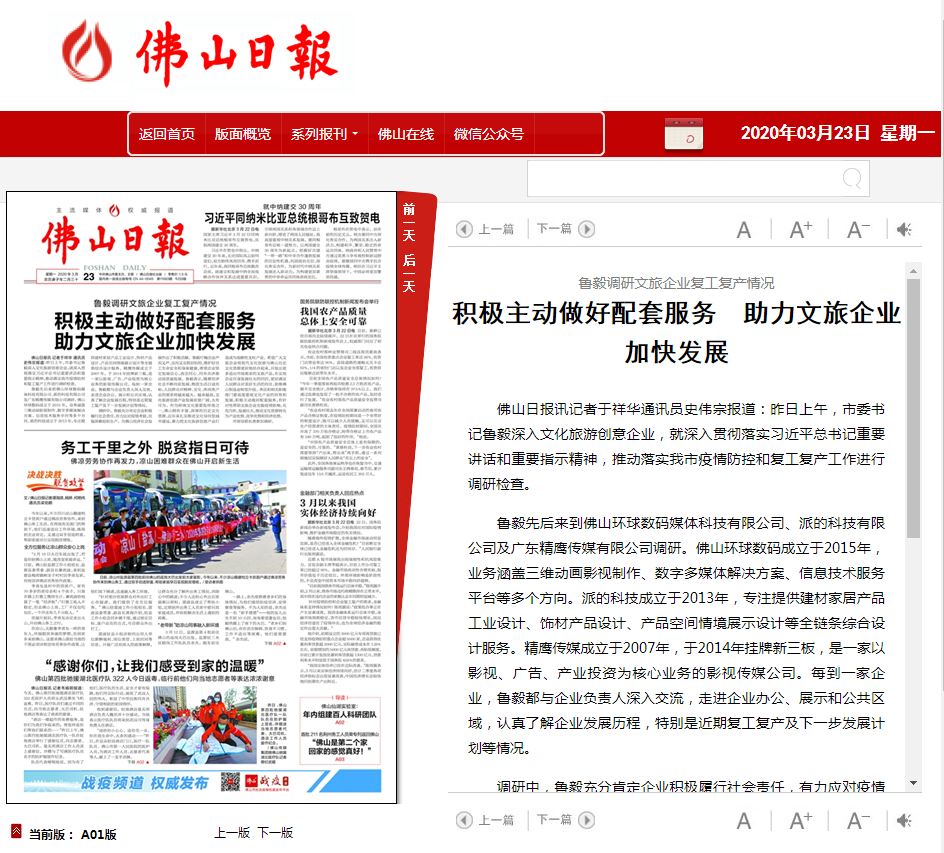 3月22日上午10点,在市委常委、宣传部部长郭长勇、市文化广电旅游体育局局长陈新文、禅城区区长孔海文等领导陪同下,佛山市委书记鲁毅来到广东新媒体产业园,实地调研文化旅游创意企业,就深入贯彻落实习近平总书记重要讲话和重要指示精神,推动落实我市疫情防控和复工复产工作进行调研检查。 ![]() ![]() 实地调研园区文创企业 鼓励创新发展 位于广东新媒体产业园的派的科技成立于2013年,专注提供建材家居产品工业设计、饰材产品设计、产品空间情境展示设计等全链条综合设计服务。 ![]() ![]() ![]()