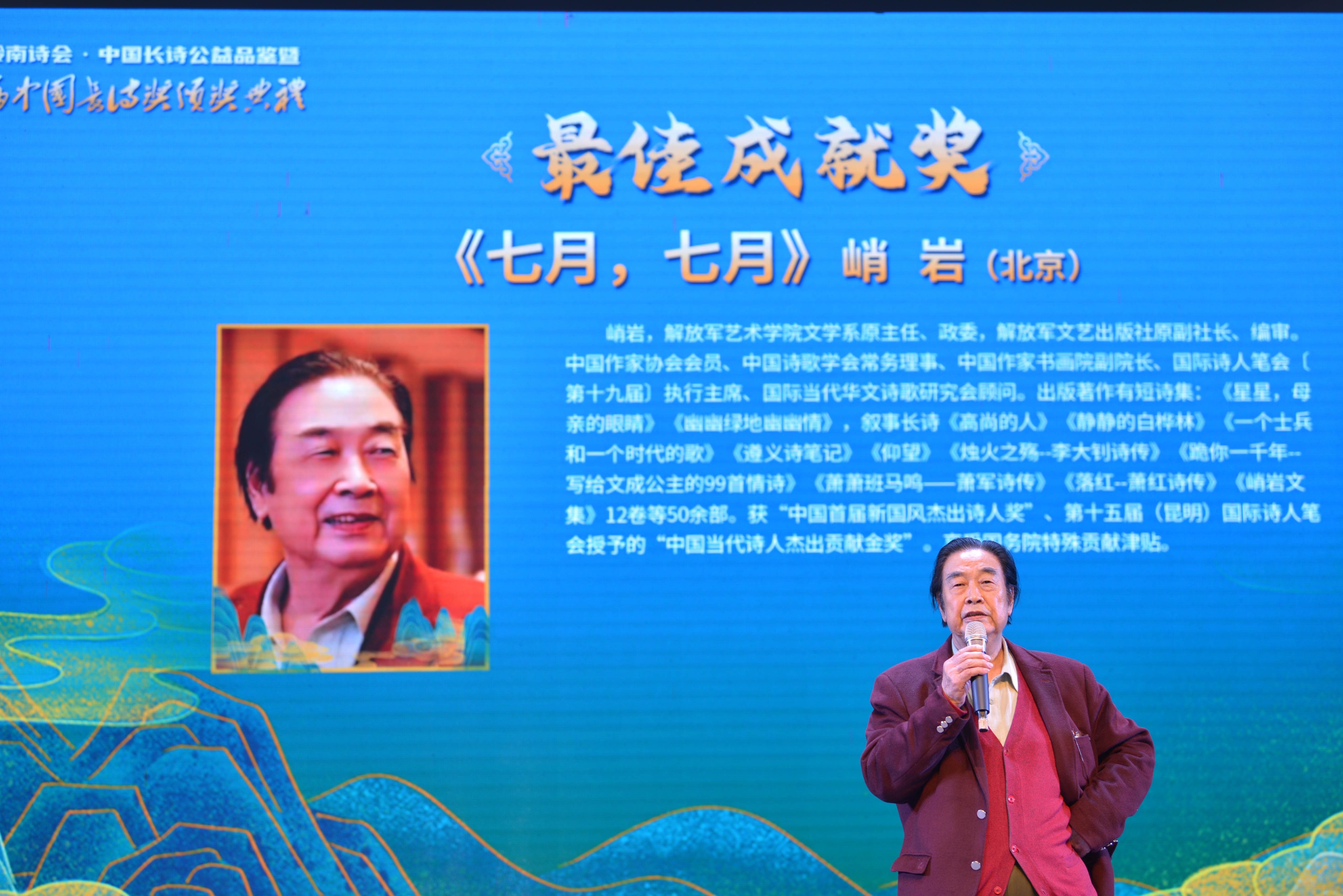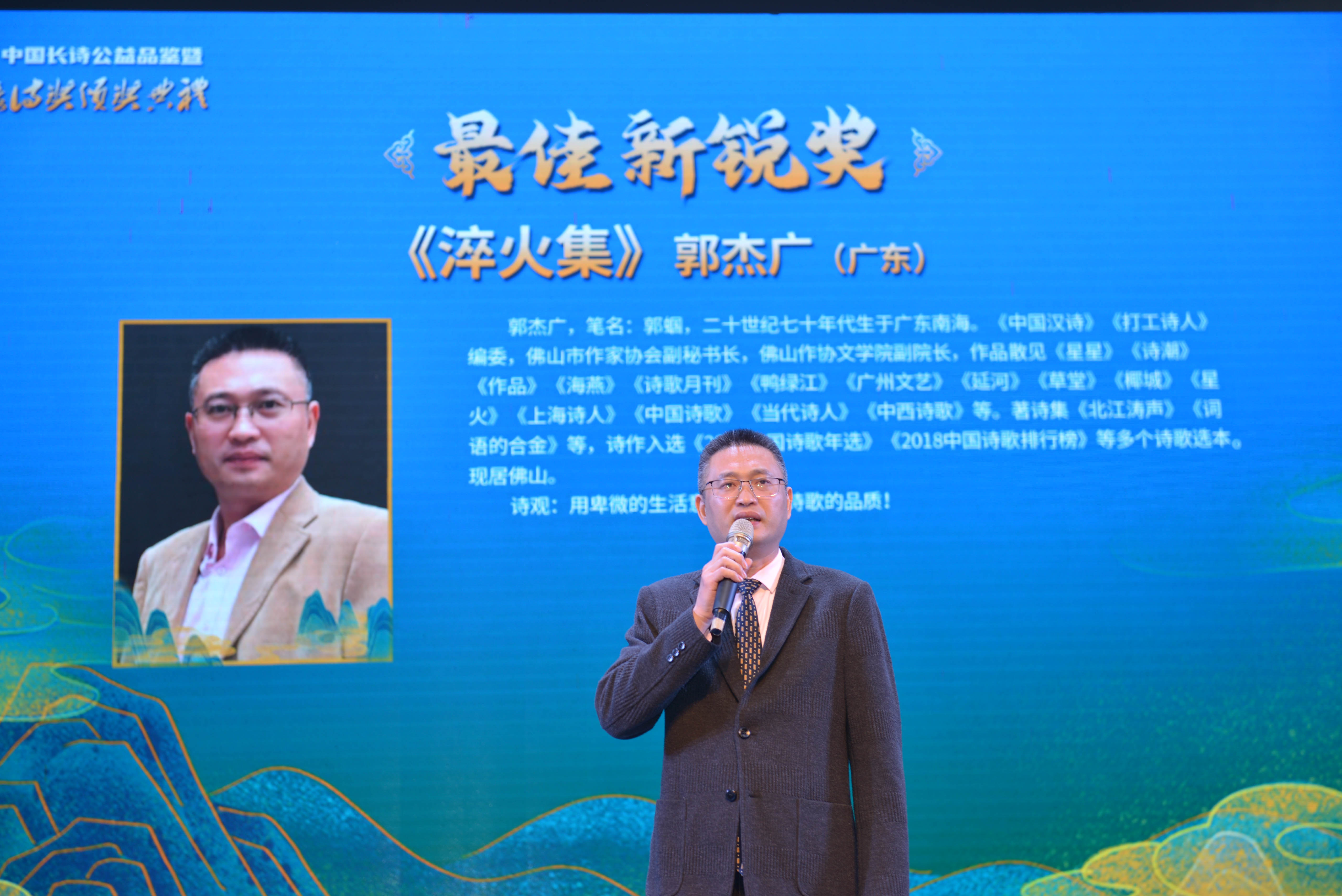 颁奖典礼上,本届长诗奖评委会副主任、广东省作家协会副主席丘树宏代表主办方宣读获奖名单。中国作家协会副主席、诺贝尔文学家获得者、著名作家莫言的长诗《饺子歌》荣获本届长诗奖特别奖;四川诗人梁平的《重庆书》、鲁迅文学奖获得者曹宇翔的《珠穆朗玛高峰》、湖南诗人胡丘陵的《戴着口罩的武汉》、江苏诗人王学芯的《草塘》、北京诗人峭岩的《七月,七月》获最佳成就奖;三届援藏干部、西藏自治区文联副主席陈人杰的《山海间》、上海诗人张予佳的《磷火是迷醉的药引》、广东诗人顾偕的《我在太阳系》、安徽诗人方文竹的《内循环》、河南诗人张竹林的《挂在树梢上的线装书》获得最佳文本奖;青海诗人马文秀的《老街口》、甘肃诗人汪渺《白马史诗》、山东诗人散皮的《传他,或者自传》和广东诗人郭杰广的《淬火集》共同获最佳新锐奖。