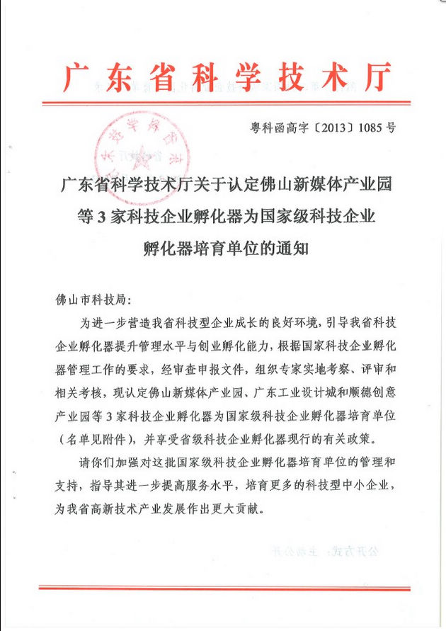 8月21日,佛山新媒体产业园获得广东省科技厅批文,标志着新媒体园正式成为国家级孵化器培育单位,享受省级科技企业孵化器现行的有关政策。今年6月份,广东首科技厅组织专家组莅临新媒体园开展认定工作,专家组一致认为:该孵化器符合国家级孵化器培育单位的认定条件,建议认定为国家级孵化器培育单位。