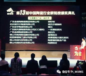 【派的网讯】 2017年3月28日下午 第13届中国陶瓷行业新锐榜 颁奖仪式在佛山新媒体产业园云空间举行,活动为来自全国各地的陶瓷创新“新锐”颁发了16个大项奖项,吸引了约350名陶企代表和行业专家参加。佛山市派的科技有限公司参赛作品《纯美粒材》仿古砖荣获第13届中国陶瓷行业新锐榜(瓷砖类)“年度最佳产品奖”。