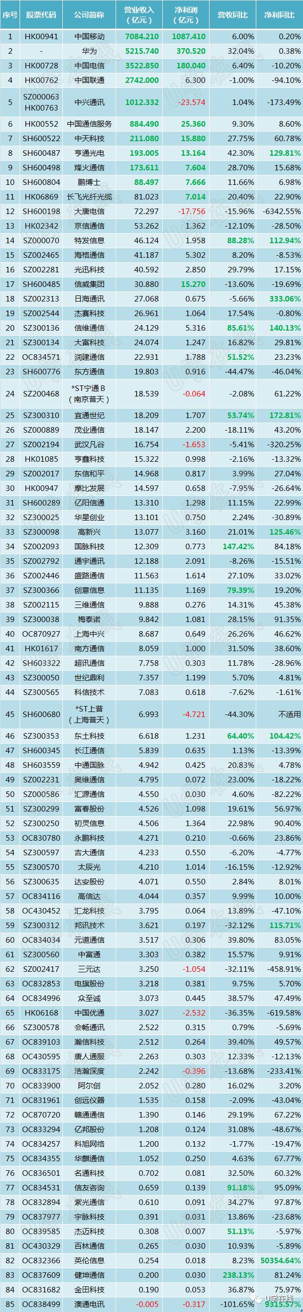 截至4月底,除了终止挂牌等原因外,上市及新三板挂牌通信企业都已披露2016年年度报告。U学在线收集整理了国内85家通信企业2016年年报材料,其中包括46家A股上市企业、1家B股上市企业、10家H股上市企业、27家新三板挂牌企业以及虽然没有上市但每年都会公布年报的通信设备巨头华为公司。