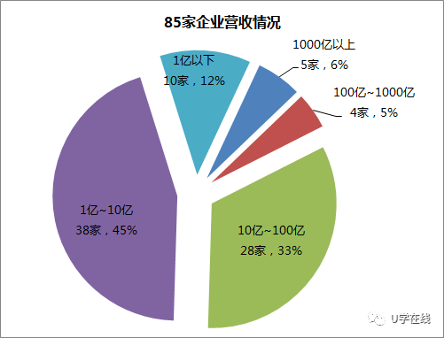85家企业中,营收在10亿元及以上的企业共有37家,占比44%,其中5家营收在1000亿元以上,4家营收在100亿~1000亿之间,28家营收在10亿~100亿之间。营收在10亿元以下的企业有48家,其中38家营收在1亿~10亿之间,其余10家企业营收在1亿元以下。