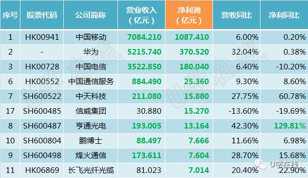 除了上述7家企业外,净利润排名前十的还有鹏博士、烽火通信、长飞光纤光缆,均达到7亿元。从净利率(=净利润/营业务收入×100%)来看,信威集团净利润约占营业收入的一半,净利率高达49.45%。