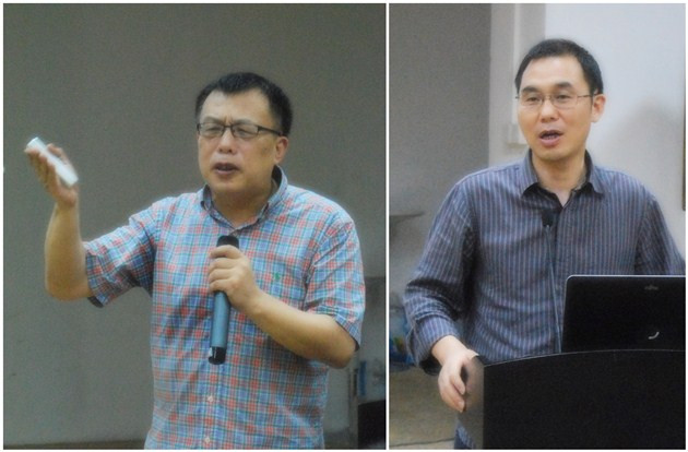 ![]() 尹虹博士(左)和陶城报管委会李新良主任(右)在发言