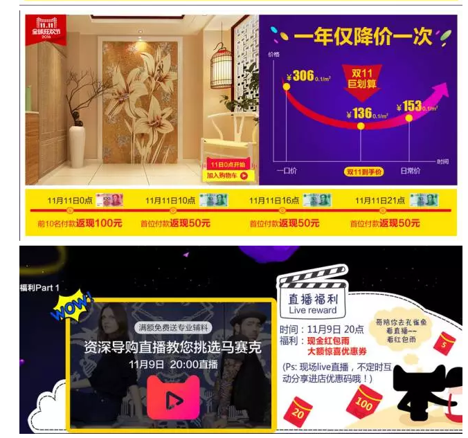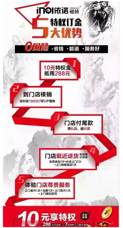 依诺天猫旗舰店上线产品均为线下实体店热销爆款,本次双11,依诺瓷砖线上线下紧密结合,消费者只要在依诺天猫旗舰店拍下10元特权金,就能到距离他最近的O2O体验店抵288元代金券+价格1500元7项上门服务大礼包。在激烈的角逐中,通过免费量尺、出图、送货上门、免费退补货安装等增值服务解决客户的后顾之忧,吸引了大量追求实惠和便利的消费者。