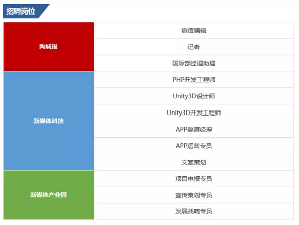 新媒体集团旗下包括:佛山市陶城报社出版有限公司、广东新媒体产业园发展股份有限公司、佛山新媒体科技有限公司。在集团已发布的招聘信息中,业务涵盖:数字出版、产业园区运营管理、互联网科技。岗位涉及文案策划、项目申报专员、微信编辑、记者、PHP开发工程师、APP运营专员、宣传策划专员、发展战略专员等众多优质岗位,计划招聘人数较去年略有增长,给各方面各领域的优秀人才创造了广阔的施展空间。