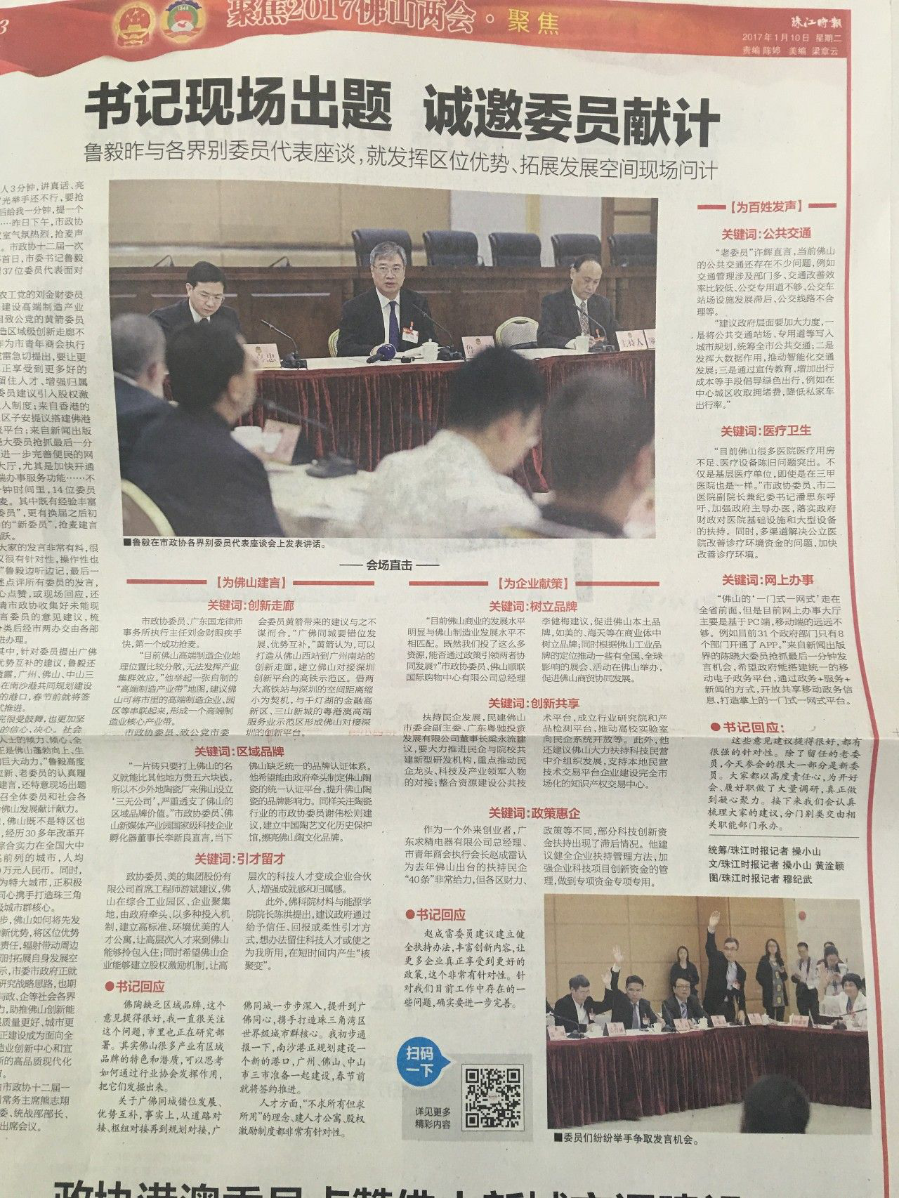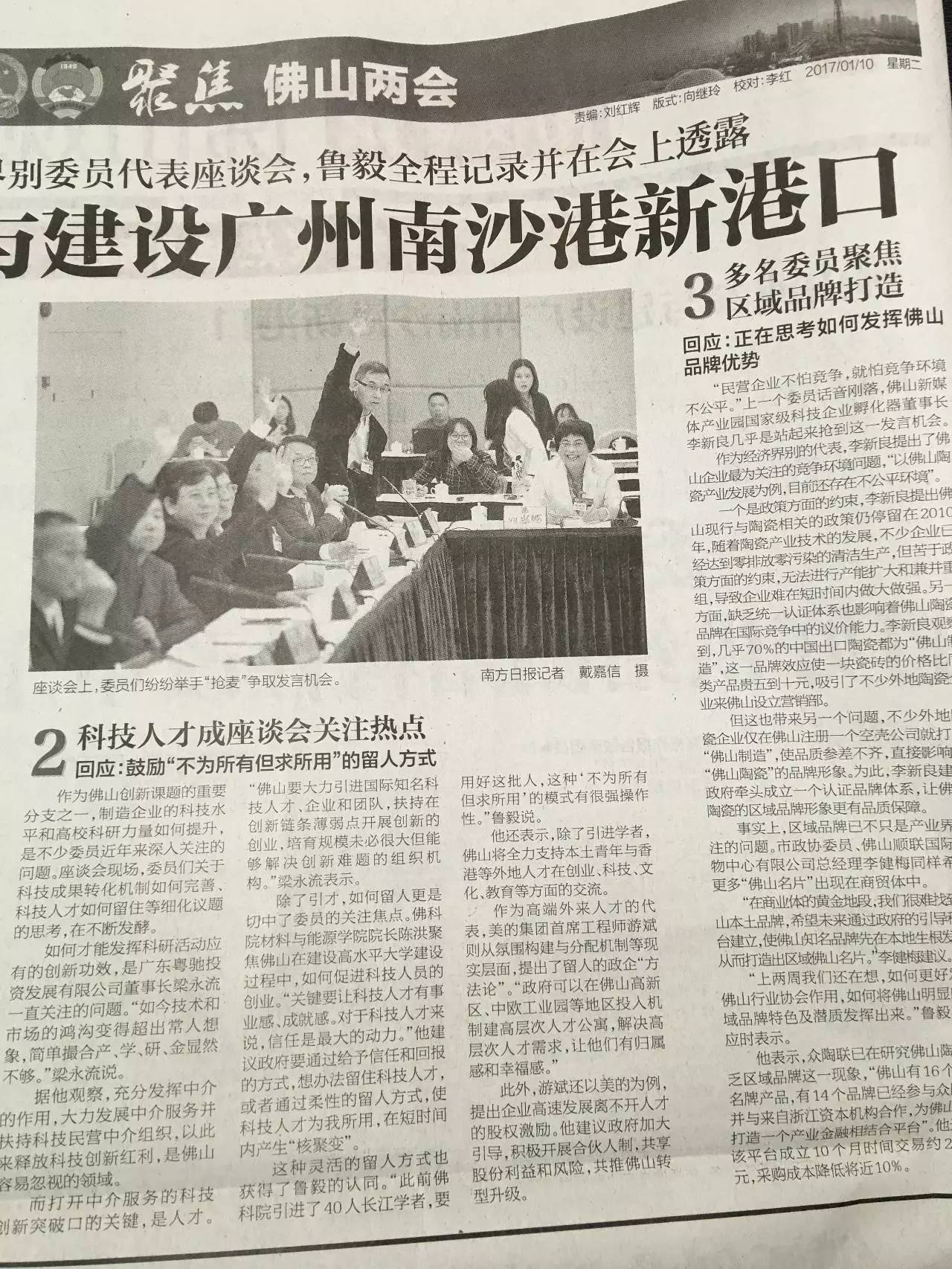 看1月10日的报纸,《南方日报》、《佛山日报》、《珠江时报》3大主流媒体不约而同使用了一张相同的照片:![]() 《南方日报》 ![]() 《佛山日报》 ![]() 《珠江时报》 这是佛山市政协十二届一次会议开幕首日,市委书记鲁毅与经济、科技界别委员代表面对面座谈。 难怪委员们争先恐后——履行代表职责,积极参政议政啊! 李新良建言 "民营企业不怕竞争,就怕竞争环境不公平。"上一个委员话音刚落,佛山市科技企业孵化协会会长、佛山新媒体产业园董事长、陶城报社管委会主任李新良几乎是站起来抢到这一发言机会,"佛山打造中国制造业创新中心,要充分调动民营企业家积极性,要为民营企业营造公平竞争环境。"他以陶瓷行业为例进行了说明。 9日,市政协委员李新良受邀参加佛山市政协十二届一次会议各界别委员代表座谈会,此次座谈会是政协委员参政议政的直接渠道和重要平台。市委书记鲁毅与经济、科技界别委员面对面交流,听取委员意见建议。 ![]()
