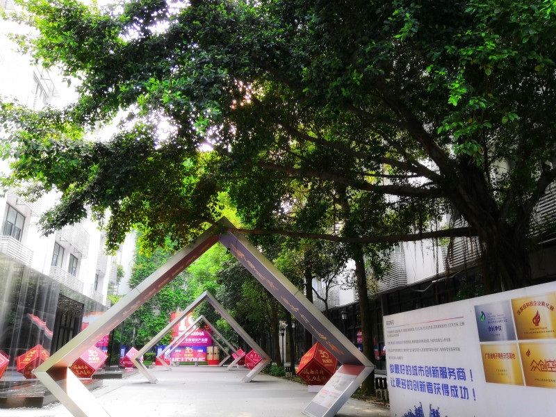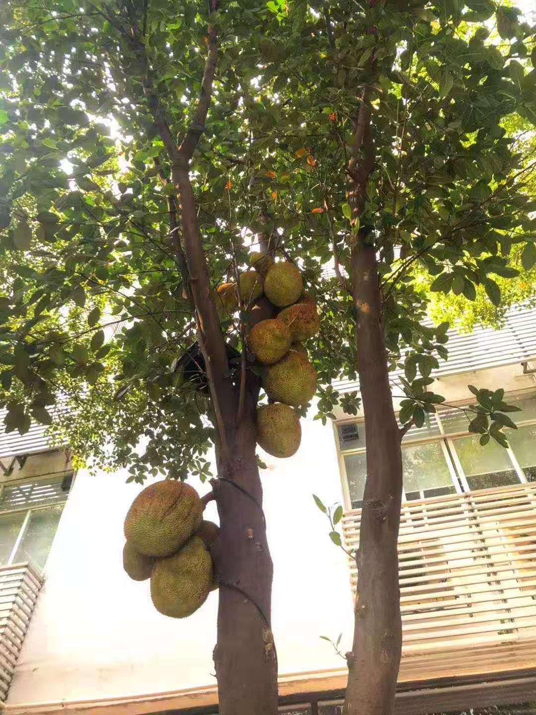 在园区01广场一隅,一棵棵菠萝蜜树郁郁葱葱;树干上,倒挂着的黄褐色菠萝蜜果团团拥簇,散发出一阵阵浓郁香味。