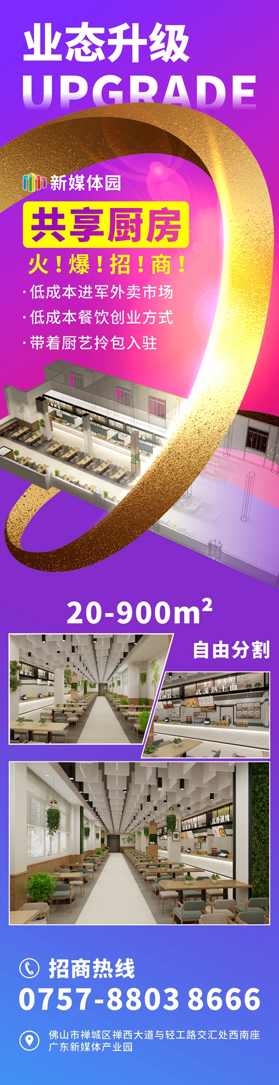 ![]() (新媒体园共享厨房效果图) 核心导读 一场疫情,改变许多人的命运,也改变了许多企业的命运。旅游、餐饮、出行、酒店民宿、娱乐等服务行业从业者大多经历了错愕、慌忙、观望、焦虑、试探等阶段,有的被迫关店“割肉止损”,有的熬过了封城、隔离却惊觉公司已经不在了,有的复工后才发现这段时间开门营业竟然比关门歇业亏得还要多…… 诚然,国内新冠病毒疫情的影响正在逐渐减弱,全社会复工复产正在平稳有序推进,这意味着生活性服务业也正同步“回血”。然而,我们不得不直面一个惨淡的现实:遭受疫情重创的众多中小餐饮企业却很可能于黎明前的黑暗中被迫“躺平”,再也等不到春暖花开——颇有些悲情,但更多的是不甘和无奈。 唯一不变的只有改变。经此一“疫”,足见传统单一的餐饮业盈利模式的抗风险能力太差,原本以“堂食为主、外卖补充”的刻板思维将难以为继。未来中小餐饮企业的品牌打造、选址逻辑、运营模式、获客方式等必将重构,餐饮企业老板和普通从业者的经营理念也必将迭代升级。 作为国家级小微企业创业创新示范基地、国家级众创空间、中国生产力众创空间,广东新媒体产业园现正打造禅城乃至整个佛山市区标志性预约式外卖餐饮企业孵化器——“共享厨房”,将为有意向入驻的餐饮企业提供各项实实在在的优惠服务,赋能广大餐饮从业者抗疫创业,打造个性品牌、有效降低运营成本、显著提升营业效率,为企业接入成熟的高性价比精准配送渠道和会员体系,帮助企业迅速建立私域流量池,摆脱对垄断型外卖平台的绝对依赖。 数据:除受疫情重创 超四分之一餐饮企业或熬得过病毒 却熬不过时间