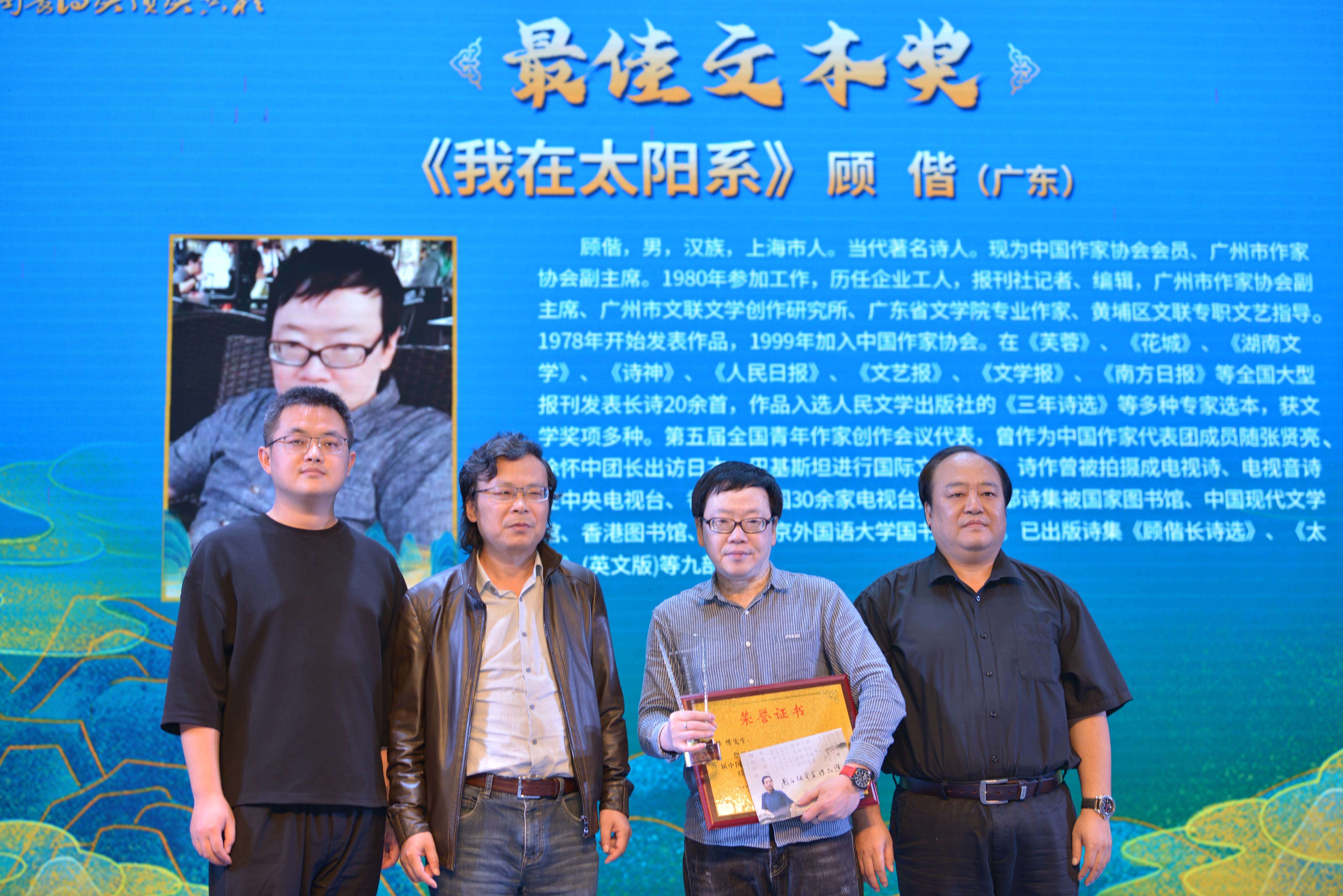 颁完奖后,佛山市作协朗诵艺术团的艺术家赵大明、丹娜、杨乐、胡潇、赵建军、李拓等深情演绎了莫言、梁平、峭岩、胡丘陵、王学芯、顾偕、郭杰广等获奖诗人的长诗作品精彩片段和著名诗人叶延滨、丘树宏的长诗作品选段,著名诗人王童即席演绎了日本著名作家川端康成的作品《伊豆舞女》精彩片段。