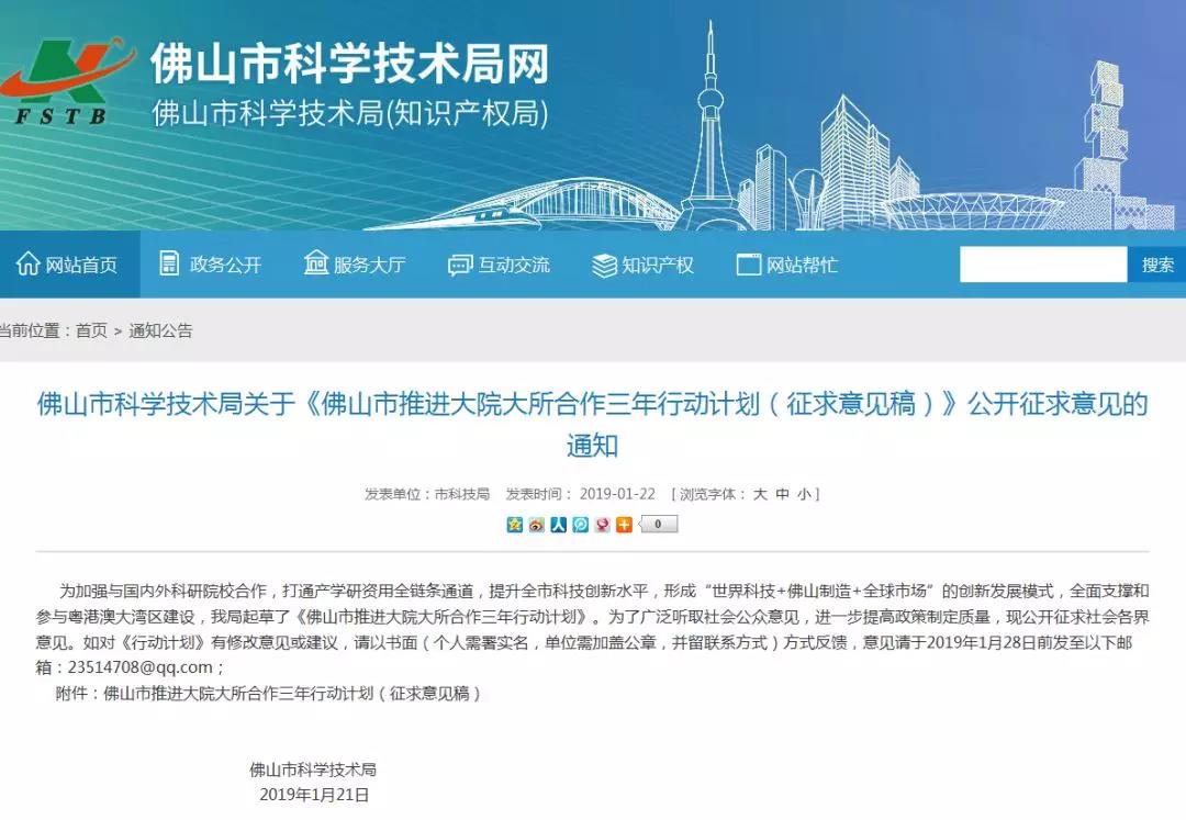 ![]() 2019年,佛山市科学技术局起草了《佛山市推进大院大所合作三年行动计划》,这项旨在让佛山制造业“发新芽”的行动计划,提及主要目标就是加大国内外顶级名校、大院大所合作及引进力度,力争推进国内外大院大所在全市合作组建科研创新载体超过100家。