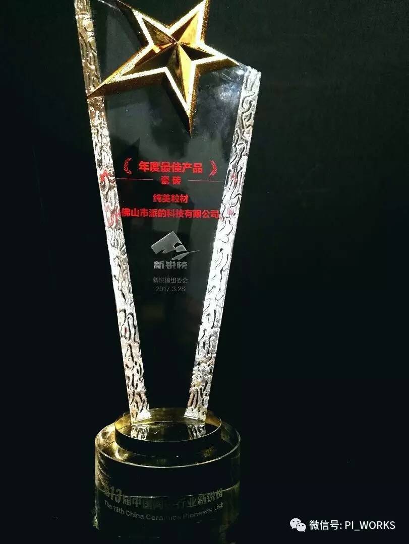 【派的网讯】 2017年3月28日下午 第13届中国陶瓷行业新锐榜 颁奖仪式在佛山新媒体产业园云空间举行,活动为来自全国各地的陶瓷创新“新锐”颁发了16个大项奖项,吸引了约350名陶企代表和行业专家参加。佛山市派的科技有限公司参赛作品《纯美粒材》仿古砖荣获第13届中国陶瓷行业新锐榜(瓷砖类)“年度最佳产品奖”。