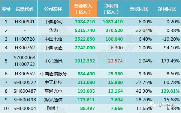 通信企业2016年业绩情况 注: 1.数据来源于各企业2016年年度报告; 2.绿字为各维度的前十名,红字表示营业收入或净利润为负值。