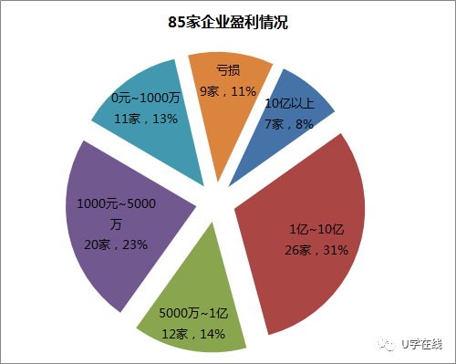 85家企业中,净利润在1000万元及以上的企业共有65家,占比76%。9家企业净利润亏损,占比11%,分别是中兴通讯、大唐电信、上海普天、中国优通、武汉凡谷、三元达、浩瀚深度、澳通电讯、南京普天,其中营业收入排在第5名和第12名的中兴通讯和大唐电信净利润亏损超过10亿元。