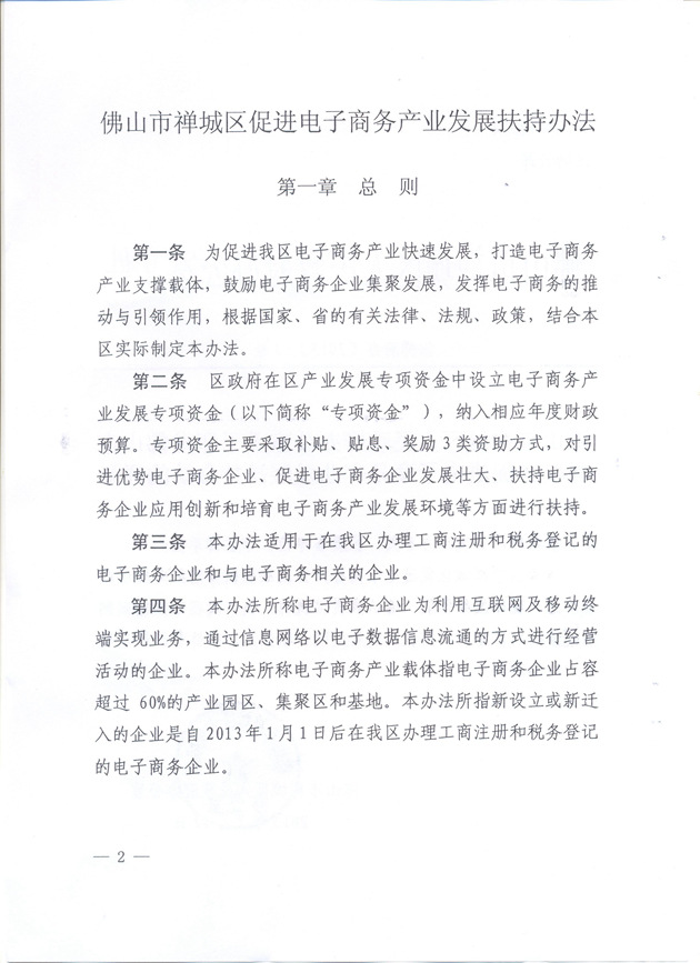 为促进禅城区电子商务产业快速发展,打造电子商务产业支撑载体,禅城区出台《佛山市禅城区促进电子商务产业发展办法》。区产业发展专项资金中每年将安排不少于2亿元用于设立电子商务产业发展专项资金,采取补贴、贴息、奖励等3类资助方式,对引进优势电商企业、促进现有电商企业发展壮大等方面进行扶持。